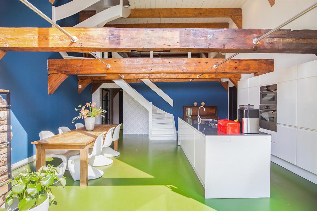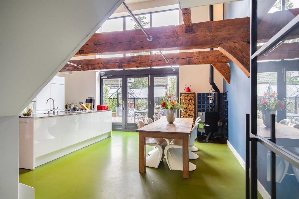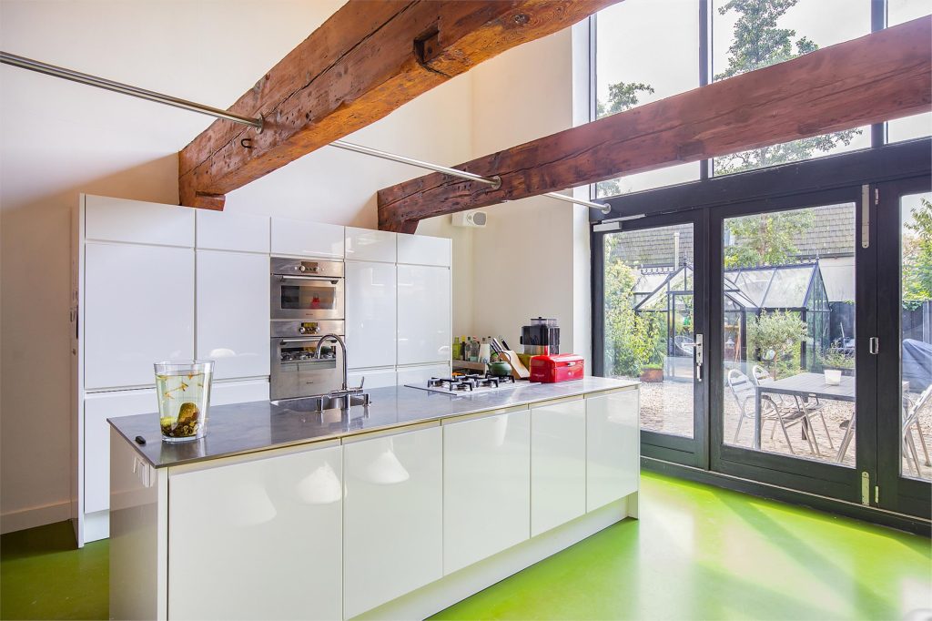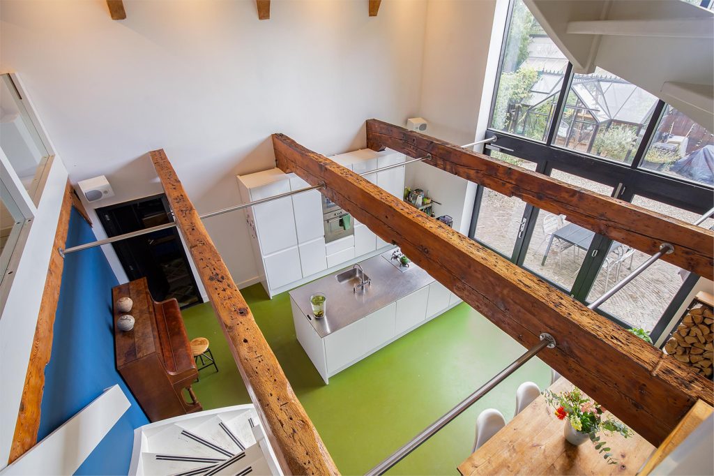 Bij betreden van de woning via de zijingang (Goudastraat) kom je in de centrale hal terecht. In deze hal vind je de doorgang (brandwerende deur) naar de logies ruimte, een toilet en aan de rechterzijde een glazen taatsdeur die je de ruime en lichte woonkeuken (5.60×6,20) binnenleidt. De 5 meter hoge glazen pui op het zuidwesten voorziet deze ruimte van veel daglicht. Kijk omhoog en je ziet de 350 jaar oude plafondbalken met indrukwekkende afmetingen!