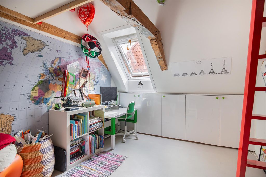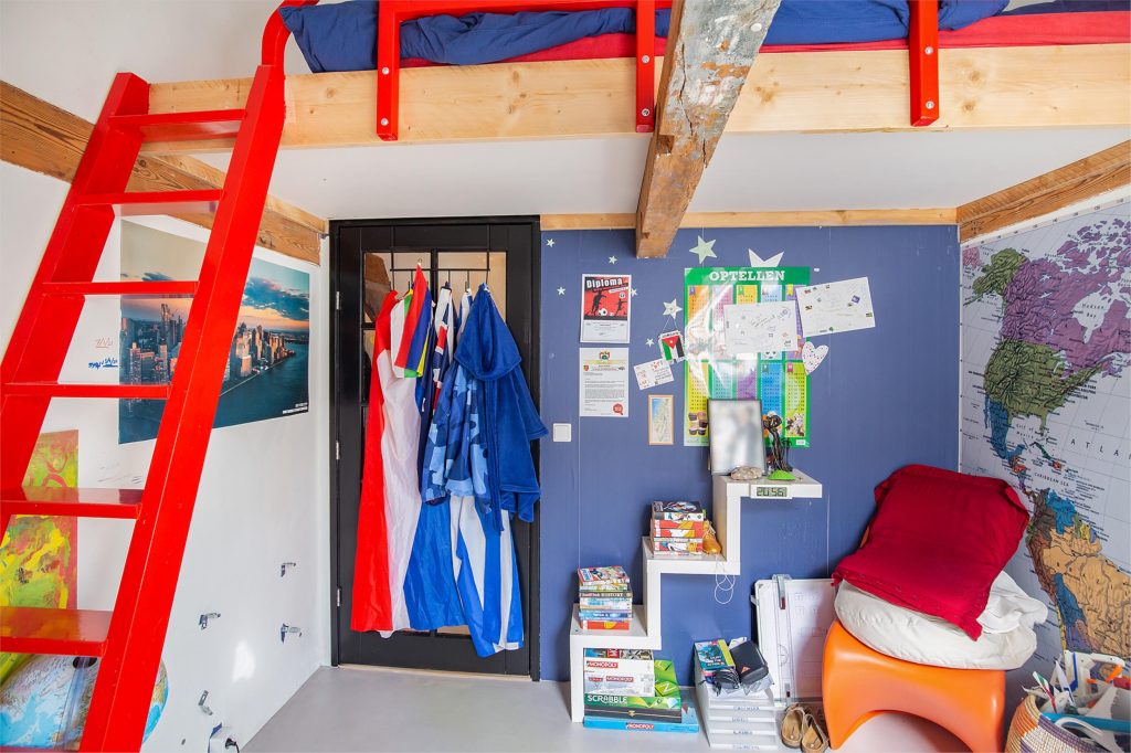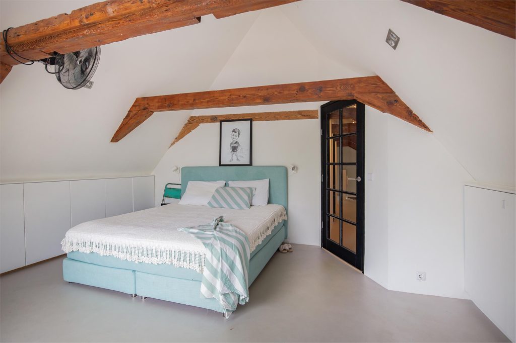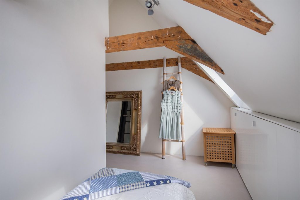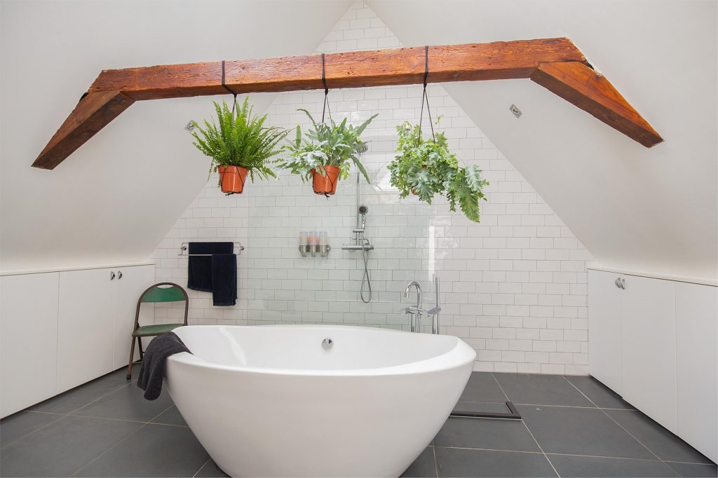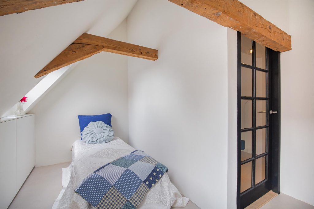 Je gaat nu verder naar boven waar je aankomt op de 8 meter lange overloop met veel bergruimte. Aan deze overloop tref je drie slaapkamers en een grote badkamer met vrijstaand bad, inloopdouche, toilet een dubbele wastafel. Door de twee grote Velux-dakramen in de nok van het dak is deze badkamer een prettige lichte ruimte. Aan de voorzijde van de woning vind je de ruimste slaapkamer met wederom het unieke uitzicht over de Zaan. Door de aanwezigheid van de oude hanenbalken, krijgt elke kamer op deze verdieping zijn eigen karaktervolle uitstraling. Elke kamer is voorzien van inbouwkasten.