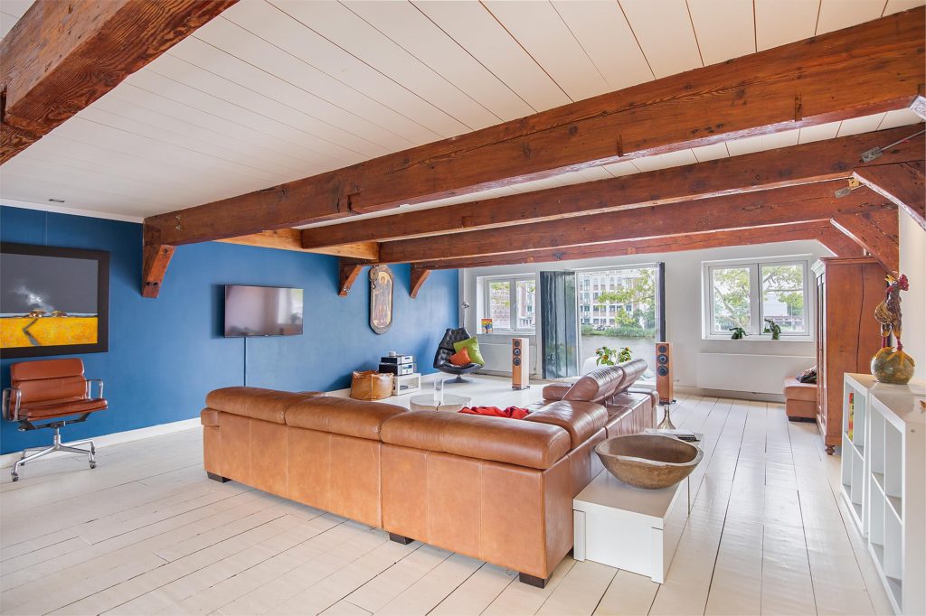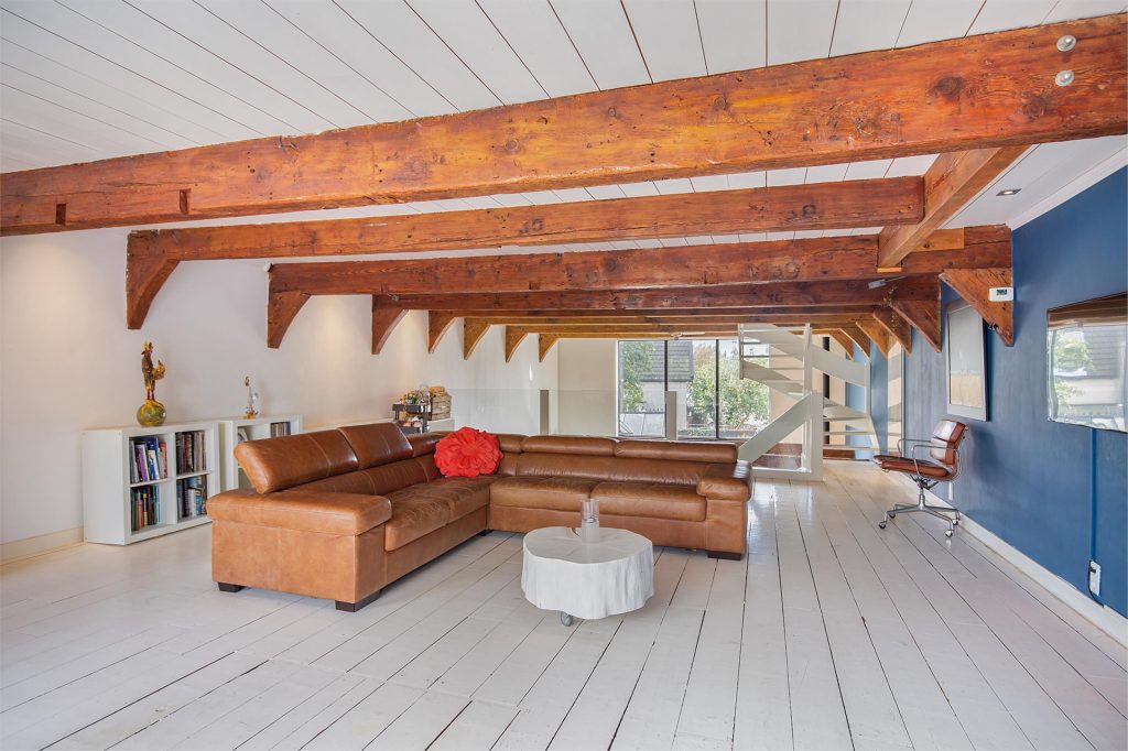 Hier tref je een zeer ruime woonkamer. Door de authentieke plafondbalken met holle korbelen (originele 17e eeuwse nummering) en een vide, is deze ruimte uniek te noemen. Vanuit de woonkamer kijk je naar de Zaan en zie je de voorbijgaande beroeps- en pleziervaart en het karakteristieke industriële erfgoed van de Zaanstreek.