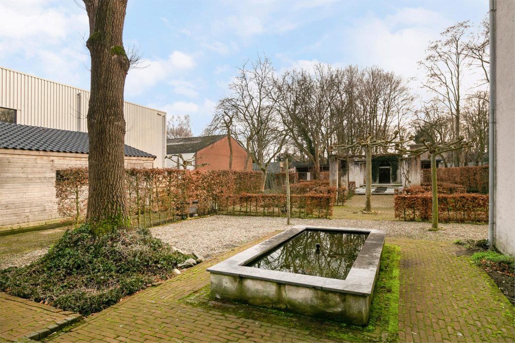 De tuin is onder architectuur aangelegd verdeeld in verschillende kamers, omzoomd door haagbeuken en doorsneden door een zuilengalerij waartussen het door een wartepomp verwarmd in natuursteen uitgevoerde zwembad van 8 x 4 meter gelegen is en eindigt bij het tuinhuis. De tuin is gelegen op het zuiden. Het geheel is voorzien van een volautomatische beregeningsinstallatie.