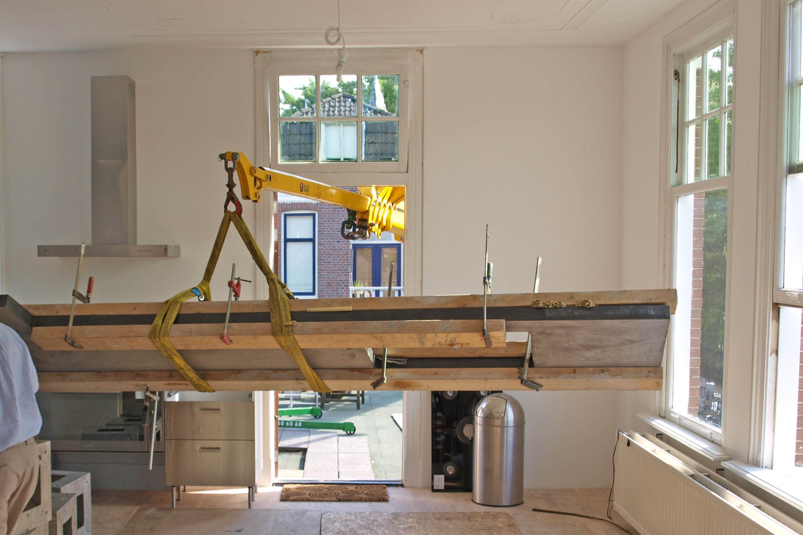 Voor de keuken is gekozen voor een lage inrichting zonder hoge kasten, zodat een enorm werkblad ontstaat. Dit in zwart beton gegoten blad bestaat uit twee delen van tezamen driekwart ton. Voor de plaatsing moest de telescooparm van de hijskraan met grote precisie door de terrasdeur en in tweede instantie door een raam naar binnen worden gestoken.